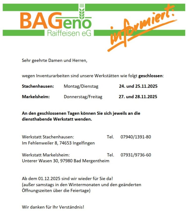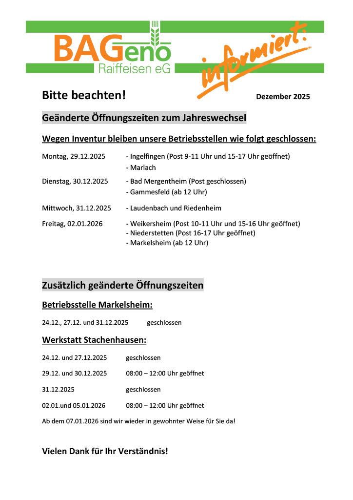 Entdecken Sie regelmäßig wechselnde Aktionen, Sonderangebote und Produktneuheiten in unserem aktuellen BAGeno-Prospekt. Ob Agrarbedarf, Landtechnik, Futtermittel oder Gartenprodukte – hier finden Sie alles, was Sie für Ihren Betrieb oder Haushalt benötigen, übersichtlich zusammengestellt. Einfach durchblättern, informieren und von attraktiven Konditionen profitieren!