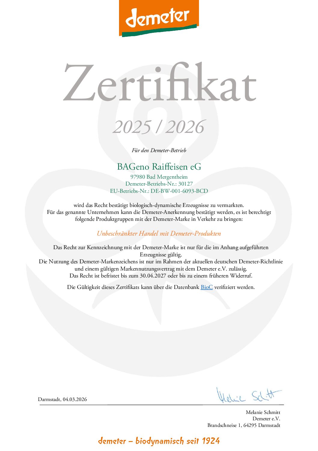 Als zuverlässiger Partner für Landwirtschaft, Energie und Handel steht die BAGeno Raiffeisen eG für höchste Standards in Qualität, Sicherheit und Nachhaltigkeit. Unsere vielfältigen Zertifizierungen belegen unser Engagement für geprüfte Prozesse, transparente Lieferketten und umweltbewusstes Handeln – von der Futtermittelsicherheit über Lebensmittelschutz bis hin zum Recycling landwirtschaftlicher Materialien.